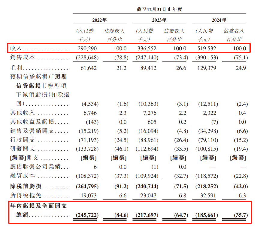 招股说明书显示,2022年、2023年及2024年,海马云营业收入分别为2.9亿元、3.37亿元和5.20亿元,净利润分别为-2.46亿元、-2.18亿元和-1.86亿元。