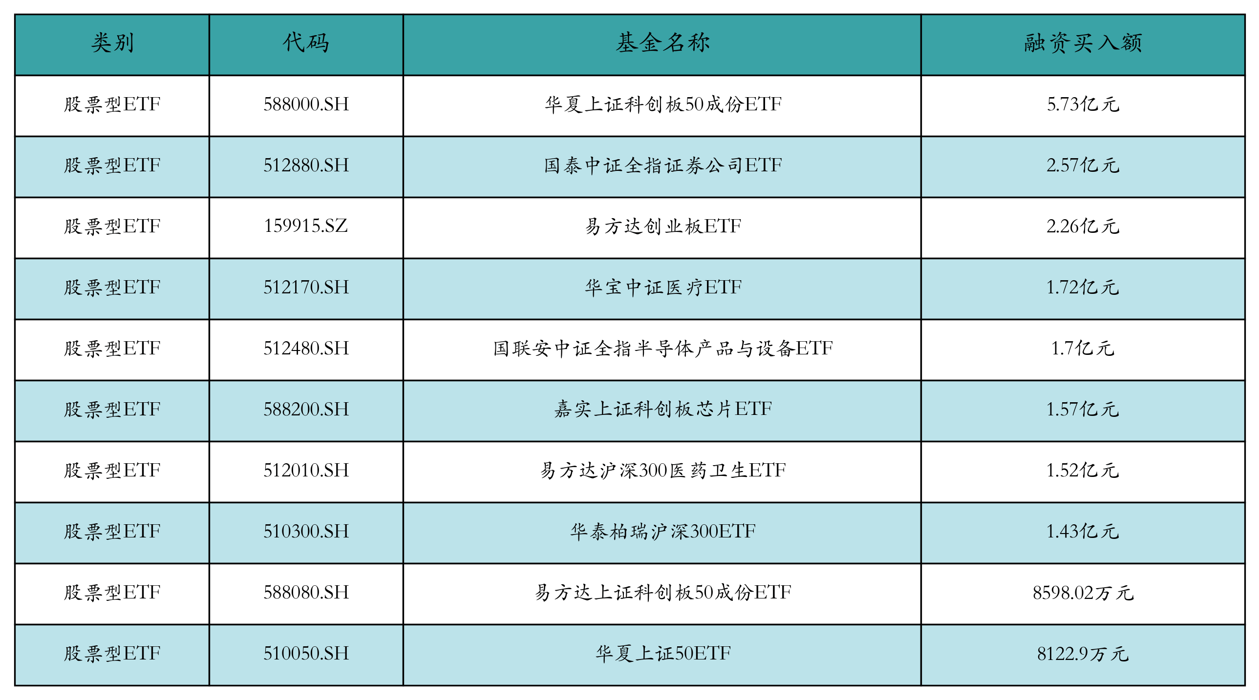 昨日股票型ETF融资买入额最高的3只ETF及其买入金额分别为:华夏上证科创板50成份ETF(5.73亿元)、国泰中证全指证券公司ETF(2.57亿元)、易方达创业板ETF(2.26亿元)。融资买入额前10详情见下表: