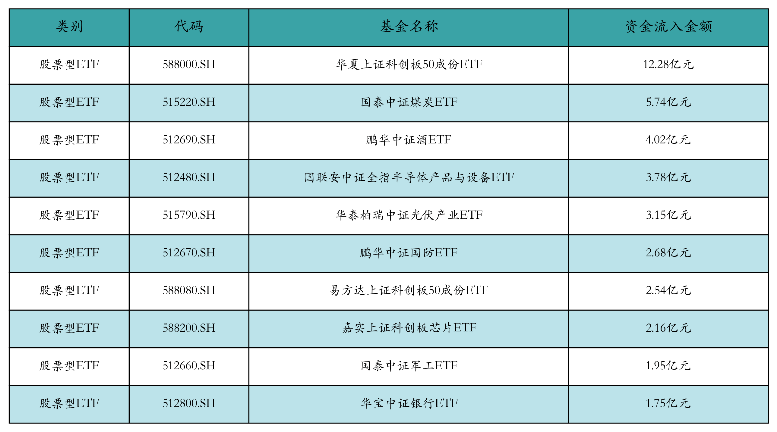 昨日股票型ETF资金流入最多的3只ETF及其流入金额分别为:华夏上证科创板50成份ETF(流入12.28亿元)、国泰中证煤炭ETF(流入5.74亿元)、鹏华中证酒ETF(流入4.02亿元)。资金流入前10详情见下表:
