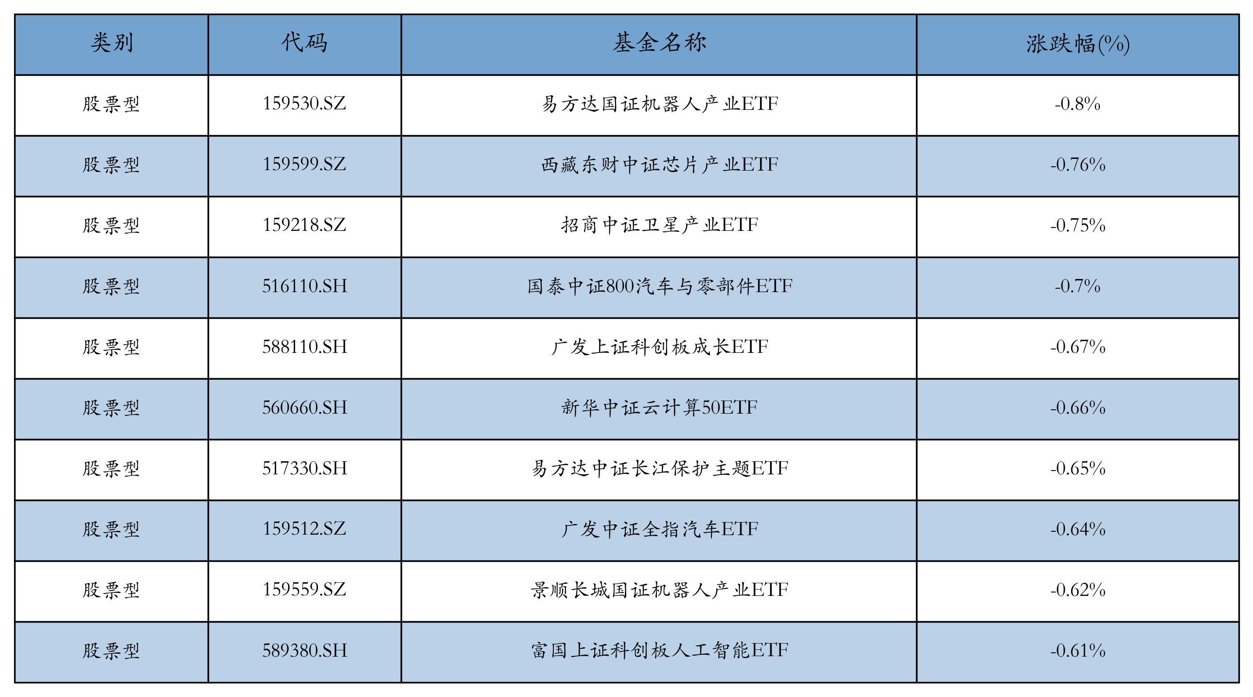 昨日股票型ETF跌幅最大的3只ETF及其收益率分别为:易方达国证机器人产业ETF(-0.8%)、西藏东财中证芯片产业ETF(-0.76%)、招商中证卫星产业ETF(-0.75%)。跌幅前10详情见下表: