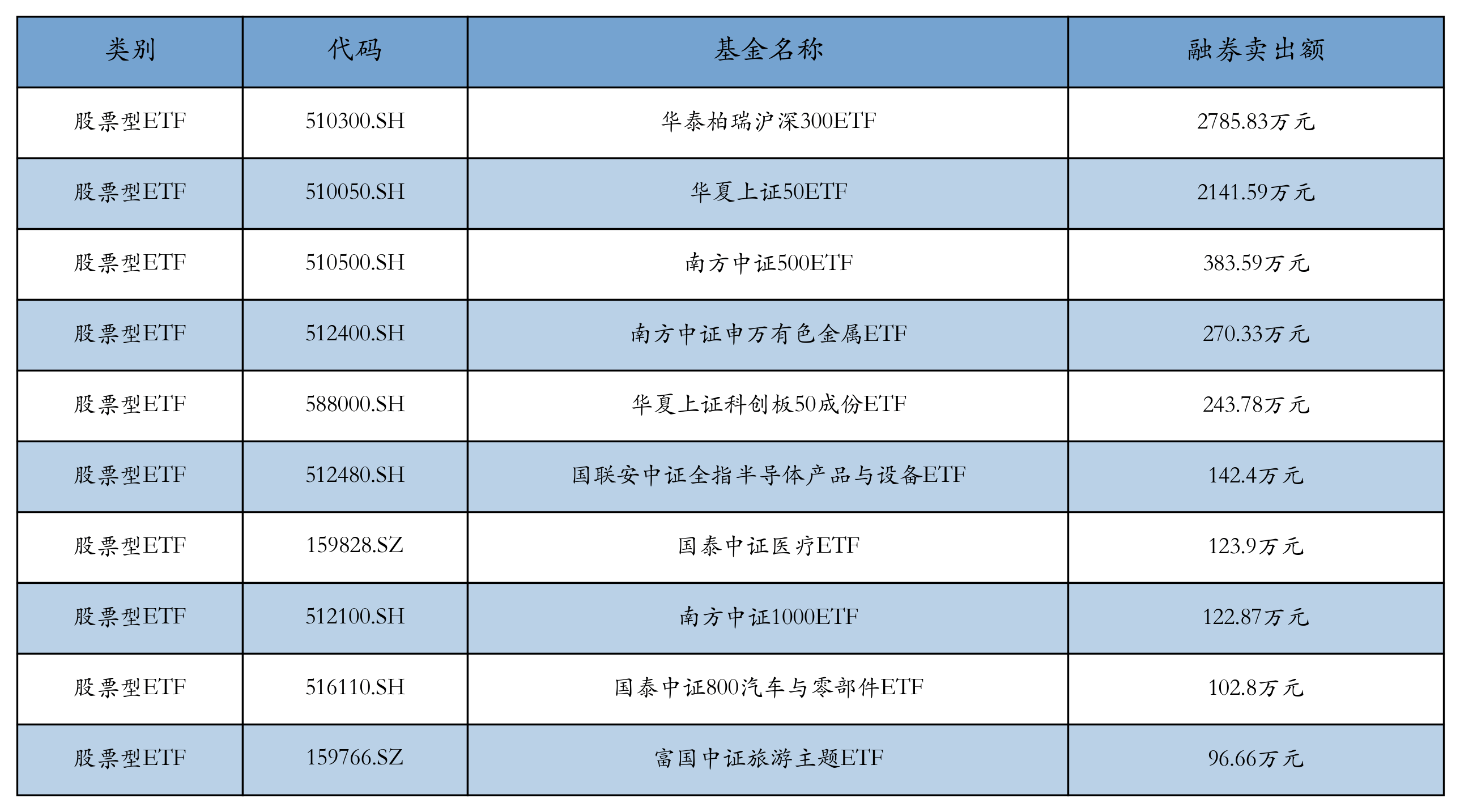 昨日股票型ETF融资卖出额最高的3只ETF及其卖出金额分别为:华泰柏瑞沪深300ETF(2785.83万元)、华夏上证50ETF(2141.59万元)、南方中证500ETF(383.59万元)。融券卖出额前10详情见下表: