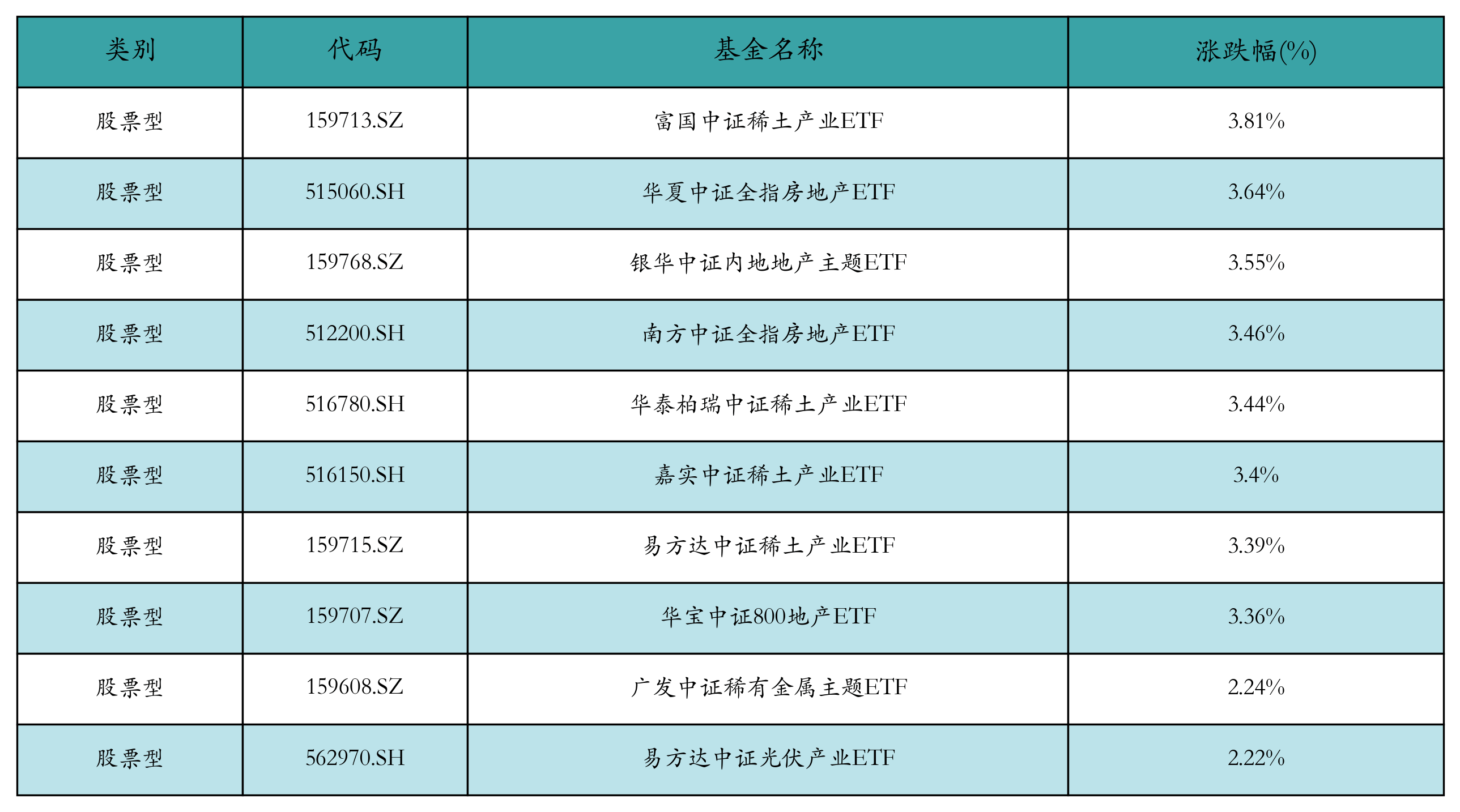 昨日股票型ETF涨幅最高的3只ETF及其收益率分别为:富国中证稀土产业ETF(3.81%)、华夏中证全指房地产ETF(3.64%)、银华中证内地地产主题ETF(3.55%)。涨幅前10详情见下表:
