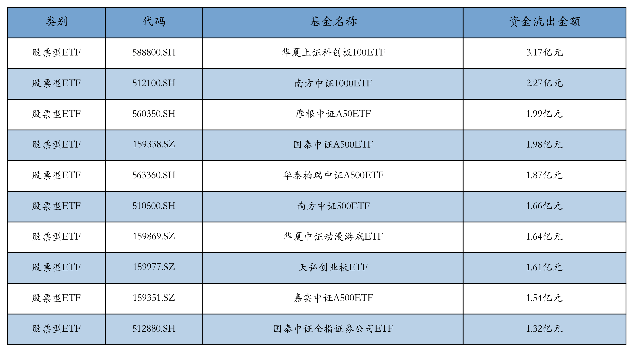 昨日股票型ETF资金流出最多的3只ETF及其流出金额分别为:华夏上证科创板100ETF(流出3.17亿元)、南方中证1000ETF(流出2.27亿元)、摩根中证A50ETF(流出1.99亿元)。资金流出前10详情见下表: