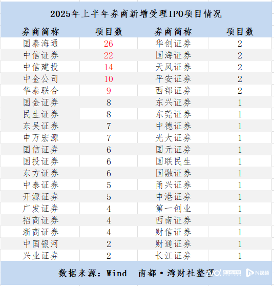 从总体情况来看,在2025年上半年,177家获得受理的IPO企业由38家券商参与保荐。其中,华润新能源控股有限公司的IPO项目由中金公司、中信证券两者联合保荐;上海兆芯集成电路股份有限公司的IPO项目由国泰海通和东方证券联合保荐。其余企业的IPO项目均由单一券商保荐。