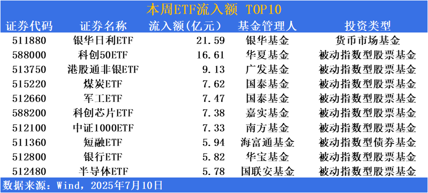 本期(2025年7月7日-7月10日)场内资金仍旧关注高股息策略,尽管市场风险偏好有所改变,但在当前低利率环境下,机构资金仍旧稳字当头。煤炭ETF(515220)、军工ETF(512660)、银行ETF(512800)等价值类ETF产品流入居前。