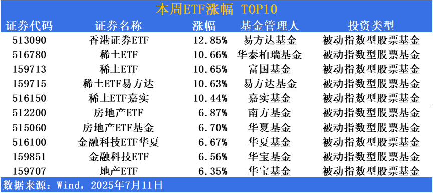 涨幅方面,政策加持下,稀土、地产ETF显著受益