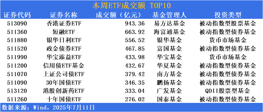 成交额方面,香港证券ETF(513090)周成交额达943.36亿元,位居榜首。短融ETF(511360)、银华日利ETF(511880)成交额分别为663.92亿元与556.52亿元紧随其后,债券类基金场内交投保持较高活跃度。