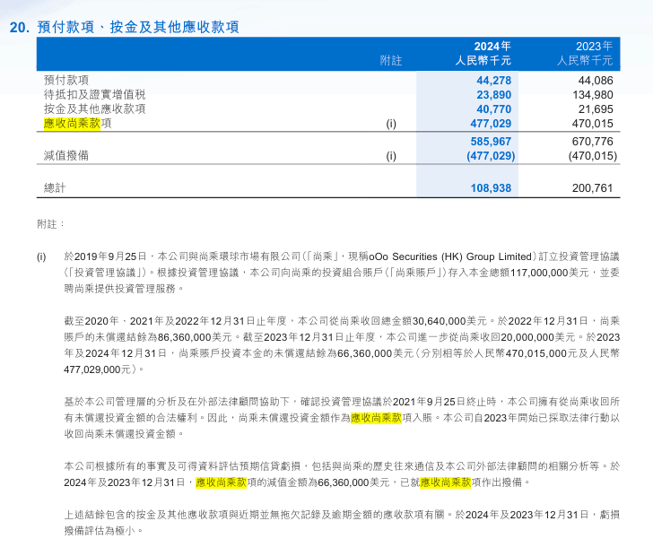 截至2024年末,复宏汉霖账面上仍有一笔6636万美元(约合人民币477029000元)的“应收尚乘款项”,已全额计提减值拨备。