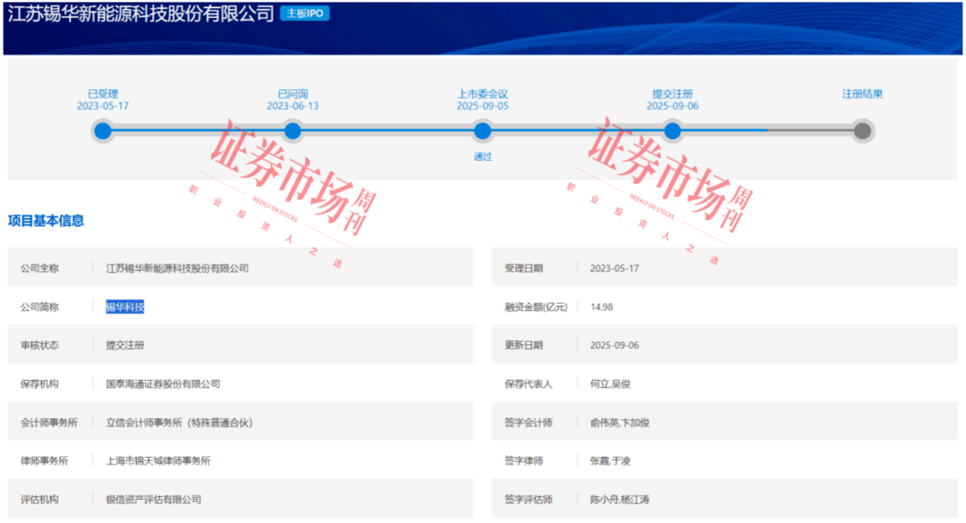 据上交所网站信息显示,江苏锡华新能源科技股份有限公司(以下简称“锡华科技”)的IPO自9月5日顺利通过上市委会议后,9月6日便向证监会提交了注册申请。