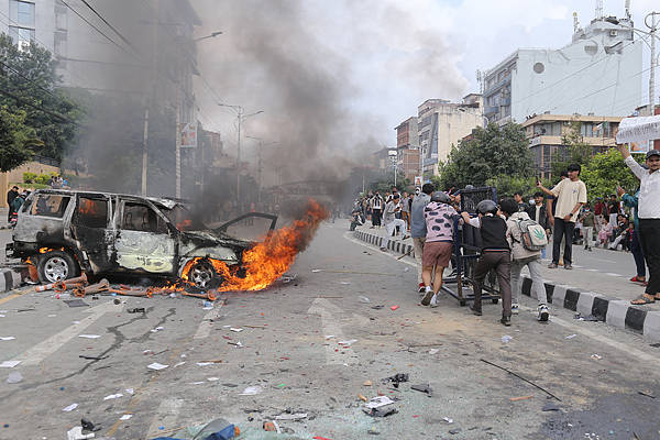 9月8日,尼泊尔加德满都,抗议者焚烧汽车视觉中国