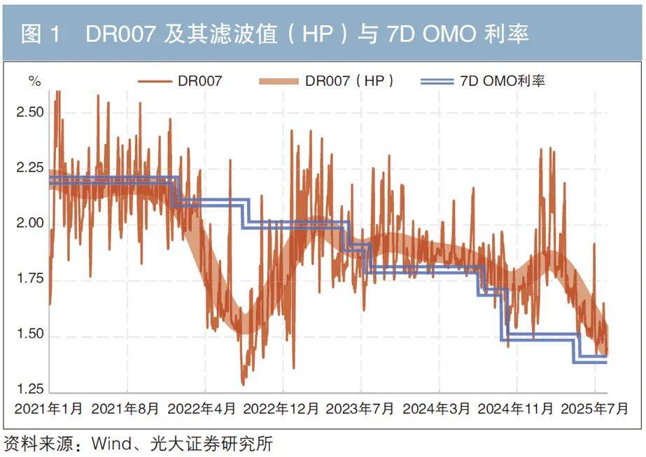 在“十四五”时期的大部分时间里,我国DR基本处于围绕OMO利率平稳运行的状态,亦有过DR相对于OMO利率偏离的阶段(见图1)。具体来看,在2022年二季度至四季度,DR007的均值低于7D OMO利率的均值39个基点(BP);2025年一季度,DR007的均值高于7D OMO利率的均值44BP。