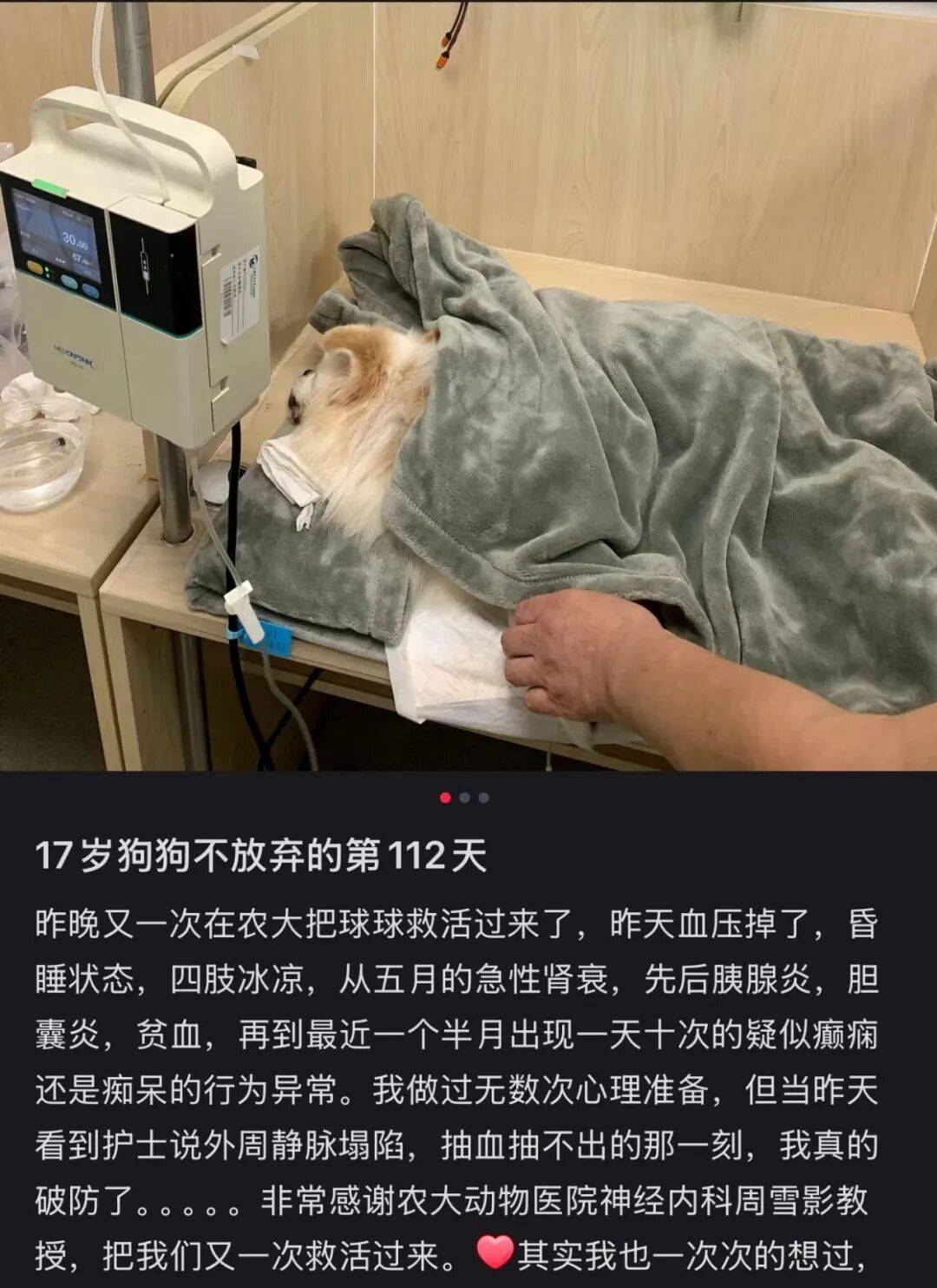 还有朋友的17岁“老小狗”,分别经历急性肾衰、胰腺炎、胆囊炎、贫血、昏迷之后,还是被医生们从生死线上拉了回来。