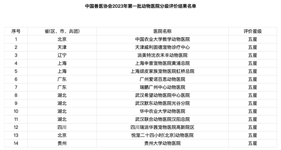 从2023年起,中国兽医协会每年都会公示出三到四批的“中国动物医院的评级”名单。