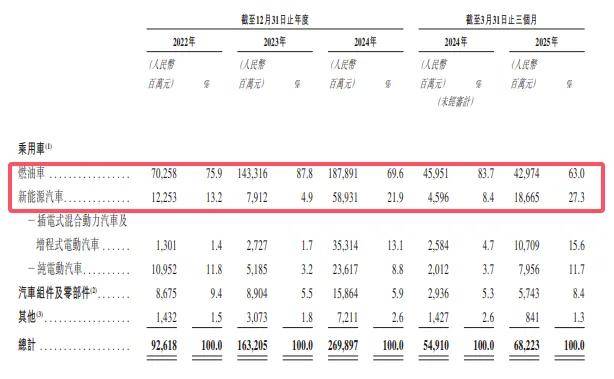 数据显示,2024年,其燃油车收入1878.91亿元,占总营收的69.6%,而新能源汽车收入589.31亿元,占比仅21.9%,其中插电式混合动力汽车收入353.14亿元,占比13.1%,纯电动汽车收入236.17亿元,占比仅8.8%。