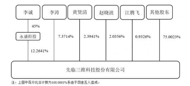 先临三维实际控制人为李诚、李涛、黄贤清、赵晓波、江腾飞,合计控制公司表决权比例为25%。