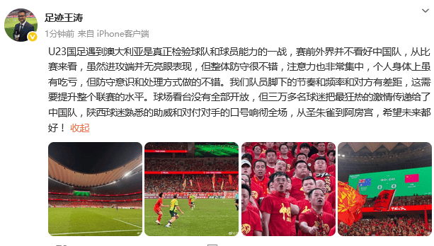 足球之夜王涛:U23国足遇到澳大利亚是真正检验球队和球员能力的一战,赛前外界并不看好中国队,从比赛来看,虽然进攻端并无亮眼表现,但整体防守很不错,注意力也非常集中,个人身体上虽有吃亏,但防守意识和处理方式做的不错。我们队员脚下的节奏和频率和对方有差距,这需要提升整个联赛的水平。球场看台没有全部开放,但三万多名球迷把最狂热的激情传递给了中国队,陕西球迷熟悉的助威和对付对手的口号响彻全场,从圣朱雀到阿房宫,希望未来都好!