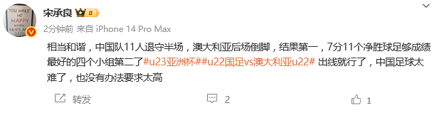 澎湃新闻宋承良:相当和谐,中国队11人退守半场,澳大利亚后场倒脚,结果第一,7分11个净胜球足够成绩最好的四个小组第二了。出线就行了,中国足球太难了,也没有办法要求太高 。