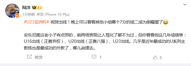 陆洋:祝贺出线!晚上可以看看其他小组哪个7分的组二成为倒霉蛋了