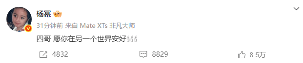 搜狐娱乐讯 9月11日,工作室证实37岁于朦胧在北京坠楼身亡,警方已排除刑事嫌疑。杨幂在社交平台上发文悼念:“四哥,愿你在另一个世界安好。”据悉,两人曾合作《三生三世十里桃花》,于朦胧饰演的白真是杨幂角色白浅的四哥。