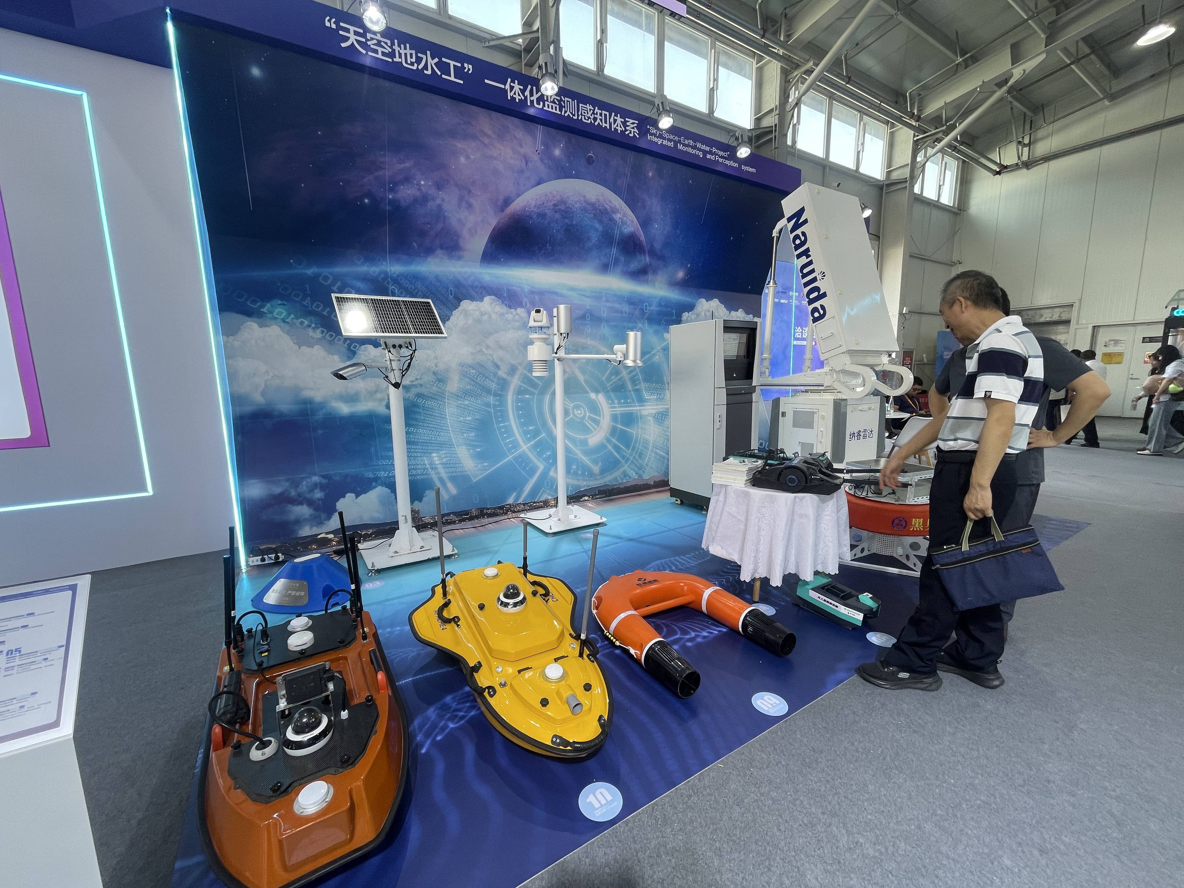为了打造这张看不见,但却能实实在在守护北京水安全的“大网”,水务部门研发了众多高科技设备。在展区,记者看到一艘颜色非常鲜亮的无人船,它搭载着多波束、水质仪等设备,可用于水文测验以及水下地形测量等多种场景。水面监测无人船则具备了水质监测、水下地形测绘、水样采集、暗管排查等功能。