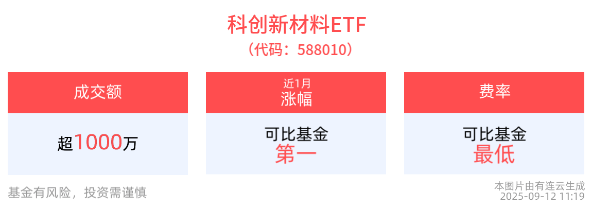 流动性方面,科创新材料ETF盘中换手6.44%,成交1945.56万元。拉长时间看,截至9月11日,科创新材料ETF近1年日均成交2920.85万元,居可比基金第一。