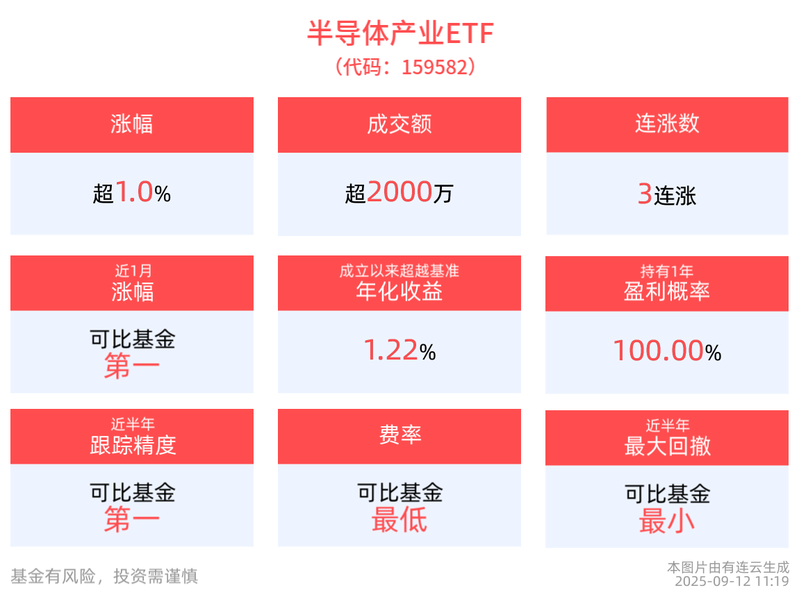 流动性方面,半导体产业ETF盘中换手11.15%,成交2372.17万元,市场交投活跃。拉长时间看,截至9月11日,半导体产业ETF近1月日均成交4707.16万元。