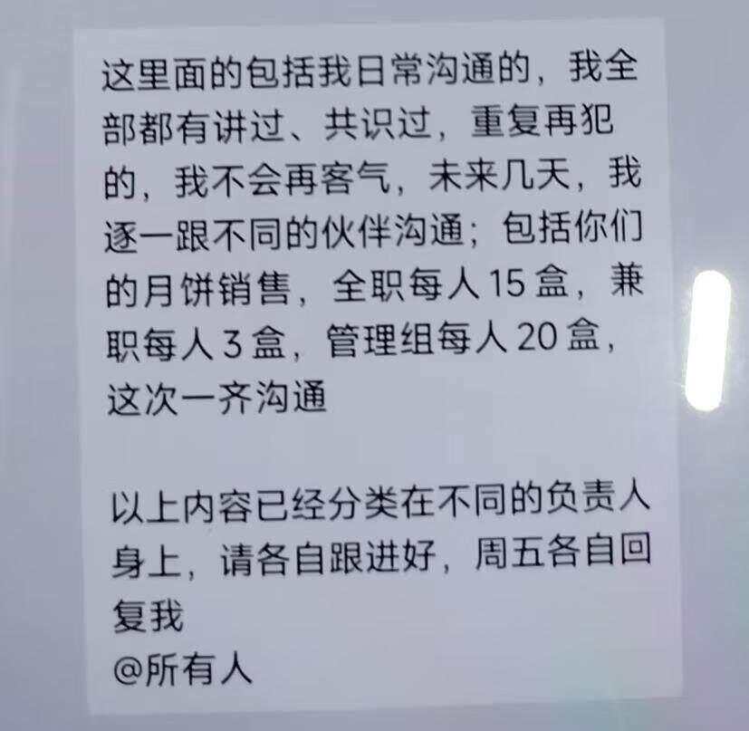 王明称,该门店经理也不会强制要求员工必须自己掏钱买月饼,但是如果完不成指标,经理会与员工“一对一复盘原因”,进行“绩效沟通”“薪酬沟通”,有些全职伙伴不想被约谈,只能自己掏钱买一盒。