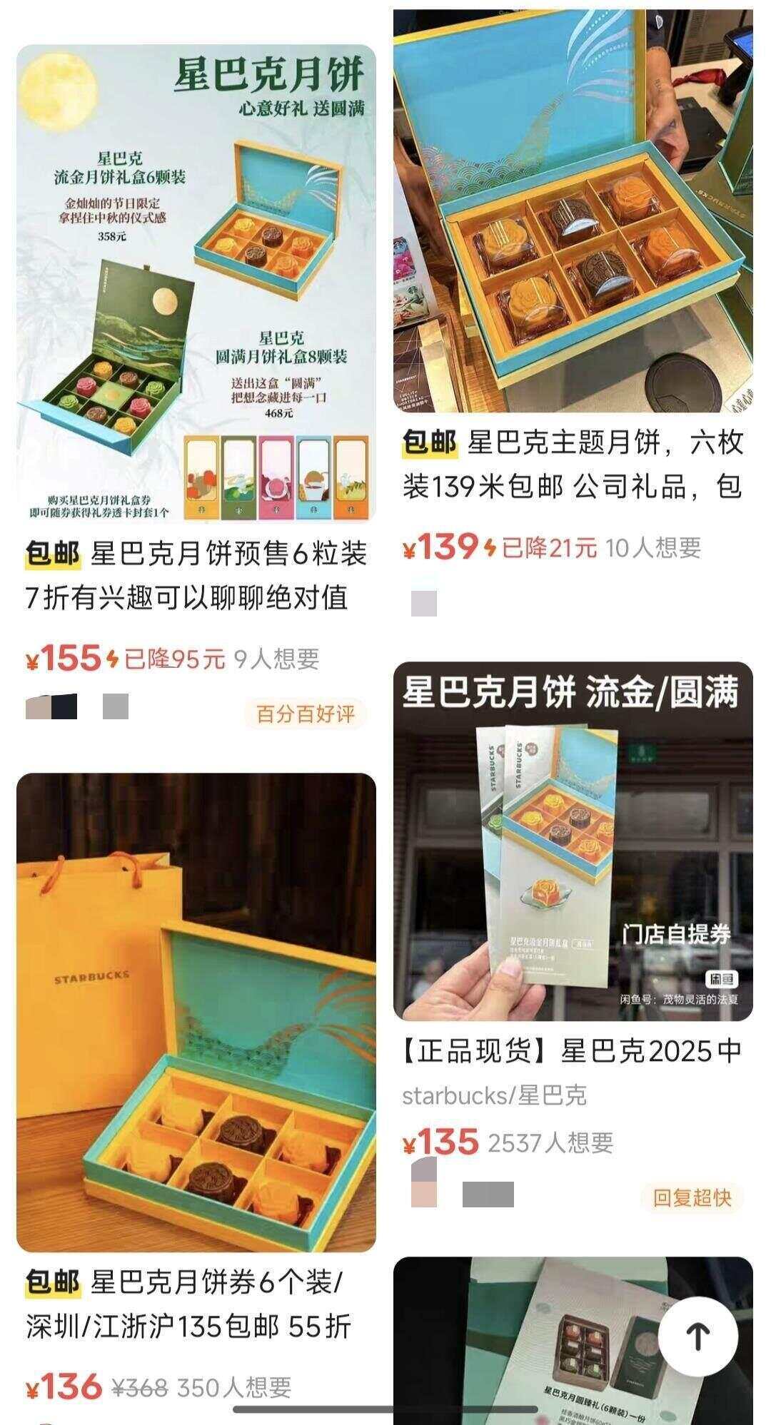 然而,在线上二手交易平台,大量商家正在以极低的价格出售星巴克月饼或者月饼礼券。如某商家售卖的月饼礼券,原价358元一盒的6颗装流金款只卖148元,原价468元的8颗装圆满款只卖220元,几乎打了4折。