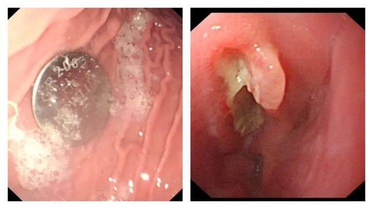 医生利用胃镜取出了卡在食道的电池,但距离孩子吞下电池已经过去10个小时,孩子的食道被电池释放的化学物质腐蚀并穿孔。
