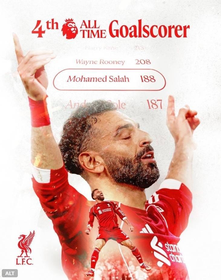 这粒进球也让萨拉赫以188粒进球独占英超历史射手榜第四位,距离第三位的鲁尼还有20球。利物浦官推也晒出海报为其纪念。