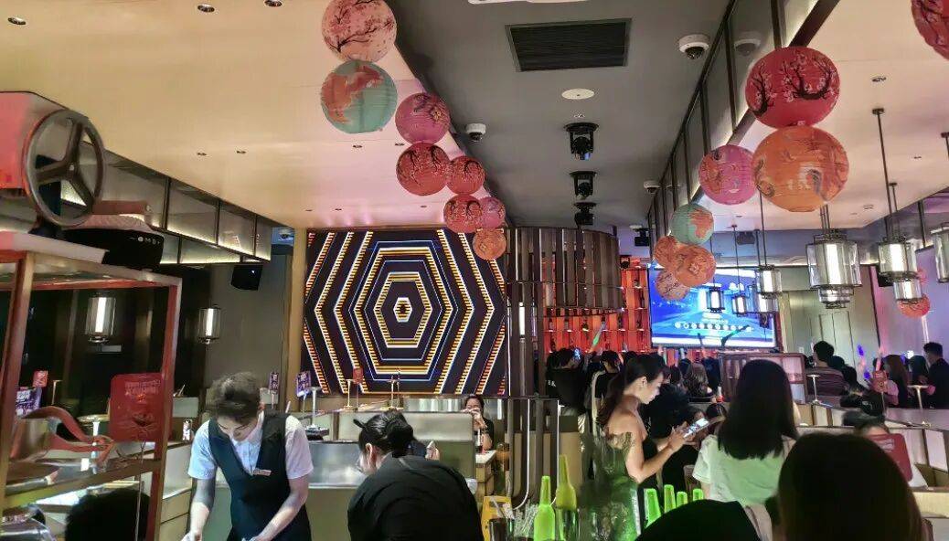 当火锅吃到最后,时钟走到22点10分,同行的朋友提醒道:“节目好像开始了。”我们丢下盘中的牛肉丸,循着声音穿过长长的走道,看见不少显然还没吃完的餐桌空无一人,刚刚还在大快朵颐的食客们,已经聚在调酒吧台与DJ舞台之间。