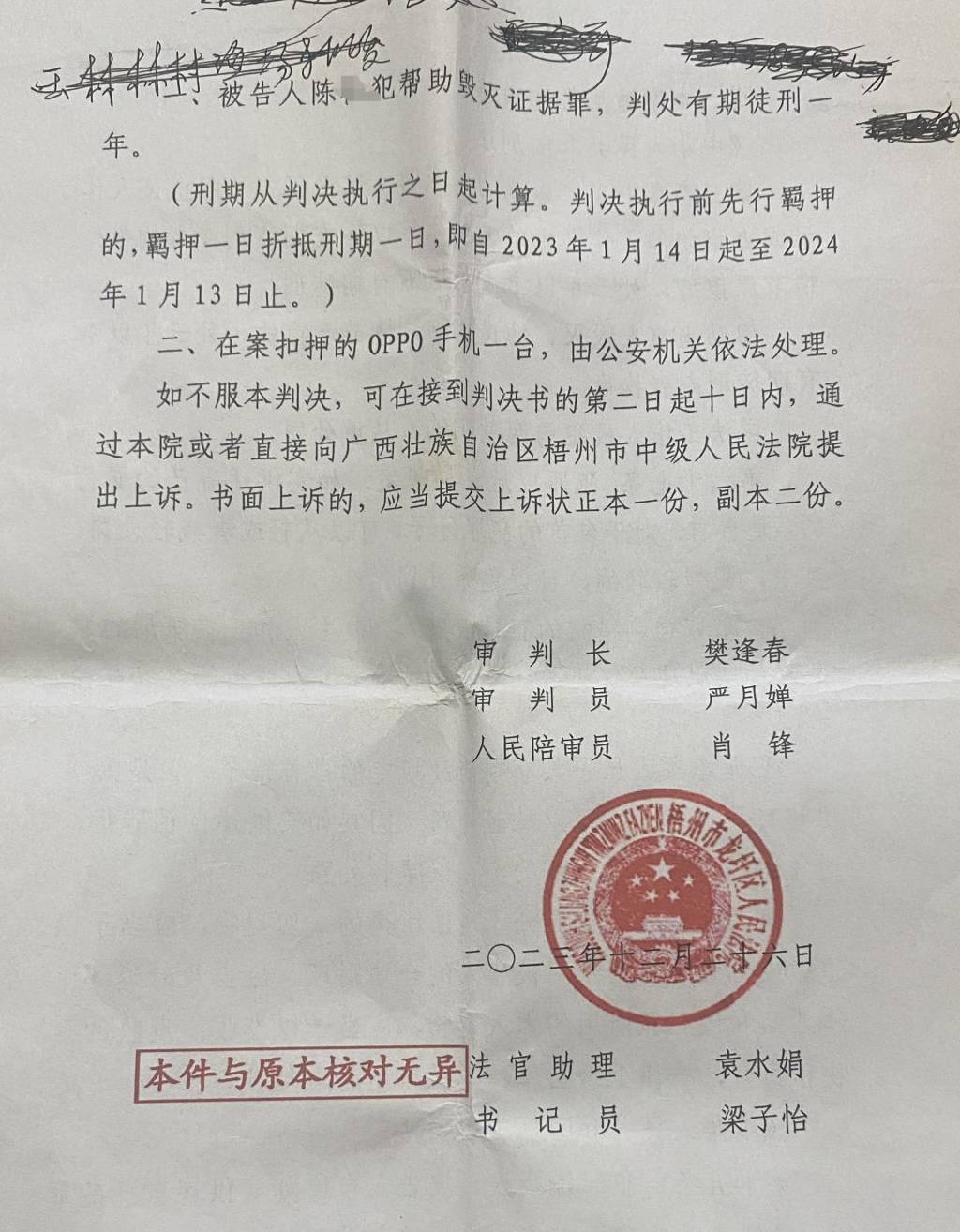 2023年12月,梧州市龙圩区法院认定陈某犯帮助毁灭证据罪,判处其有期徒刑一年。