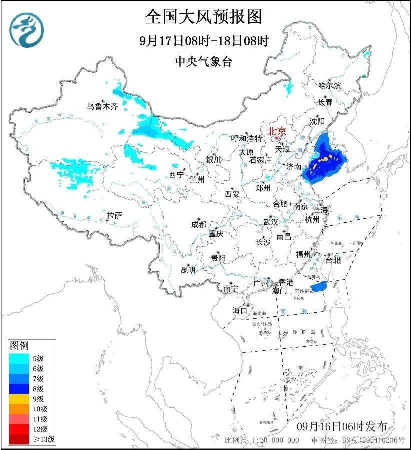 预计,9月16日08时至17日08时,新疆东部及南疆盆地、甘肃河西、青海北部、内蒙古西部和中东部、东北地区西部、山东半岛等地部分地区有5级、阵风7级的大风,其中,内蒙古东北部的部分地区风力可达7级、阵风9级;渤海、渤海海峡、黄海北部和中西部海域将有7~8级、阵风9级的大风,其中黄海中西部的部分海域风力可达9~10级、阵风11级。
