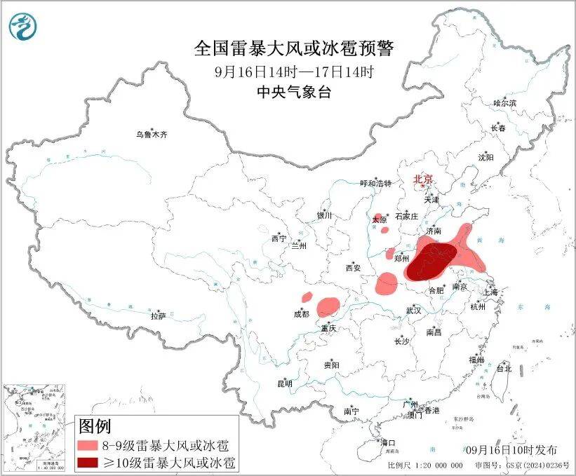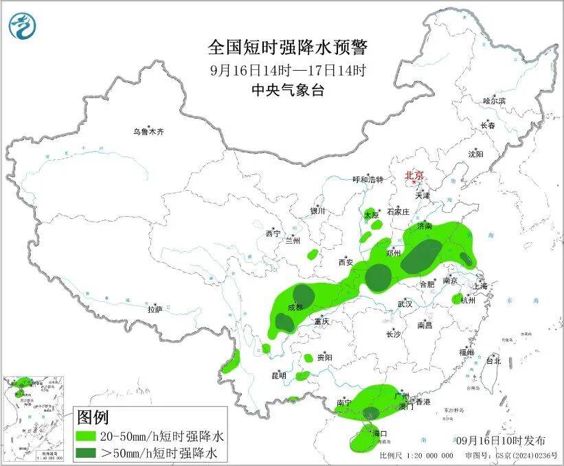 预计9月16日14时至17日14时,黄淮南部、江淮北部、西南地区东部等地的部分地区将有8级以上雷暴大风或冰雹天气,其中,山东南部、河南东部、安徽北部、江苏西北部等地的部分地区将有10级以上雷暴大风;华北西南部、黄淮南部、江淮北部、江汉北部、西南地区东部、华南南部等地的部分地区将有小时雨量大于20毫米的短时强降水天气,其中,山东南部、河南东部和西南部、安徽北部、江苏西北部、湖北北部、四川中东部、广东西南部等地的部分地区小时雨量大于50毫米,最大可达70毫米以上。