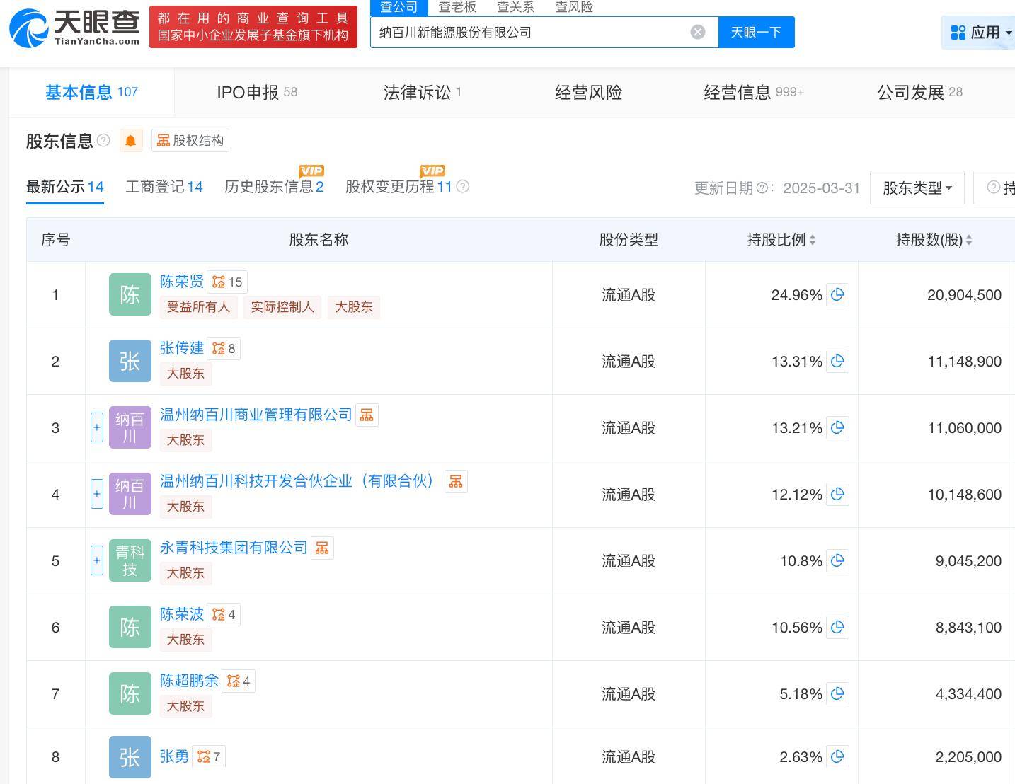 天眼查App信息显示,纳百川成立于2007年10月。目前,该公司的注册资本为人民币8375.22万元,法定代表人为陈荣贤,主要股东包括陈荣贤、张传建、温州纳百川商业管理有限公司等。