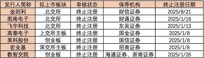 具体来看,截至9月23日,包括衡阳市金则利特种合金股份有限公司(下称“金则利”)、 杭州图南电子股份有限公司(下称“图南电子”)、苏州飞宇精密科技股份有限公司(下称“飞宇科技”)、深圳宏业基岩土科技股份有限公司(下称“宏业基” )、苏州高泰电子技术股份有限公司(下称“高泰电子” )、江苏美科太阳能科技股份有限公司(下称“美科股份” )、浙江数智交院科技股份有限公司(下称“数智交院” )7家公司过会后仍注册失败。