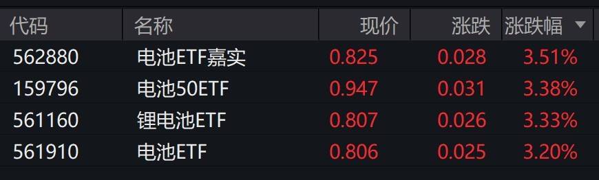 受重仓股上涨影响,电池相关ETF涨超3%。