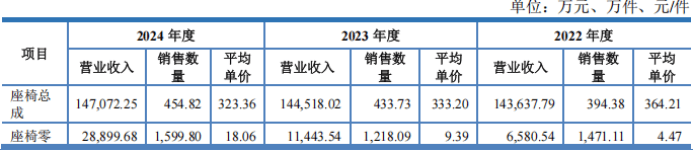 双英集团座椅业务包括座椅总成及座椅零件,其中座椅总成为核心收入。报告期内,座椅销售收入持续增长,但平均单价却出现波动,分别为80.52元/件,94.42元/件、85.65元/件。虽然座椅零件平均单价逐期增长,但座椅总成的均价却呈下行走势,分别为364.21元/件、333.2元/件、323.36元/件。