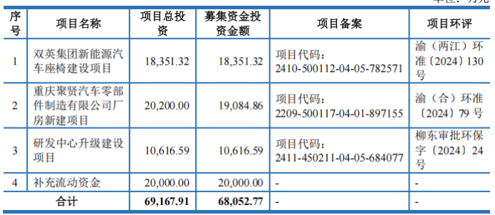 招股书显示,双英集团本次拟募集资金6.81亿元,分别投向双英集团新能源汽车座椅建设项目(下称“座椅建设项目”)、重庆聚贤汽车零部件制造有限公司厂房新建项目、重庆聚贤汽车零部件制造有限公司厂房新建项目、研发中心升级建设项目以及补充流动资金,拟投入金额分别为1.84亿元、1.91亿元、1.06亿元以及2亿元。