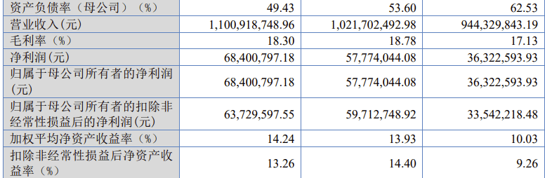 2022年、2023年、2024年,公司实现营业收入分别为9.443亿元、10.217亿元、11.009亿元,扣非归母净利润分别为0.335亿元、0.597亿元、0.637亿元。