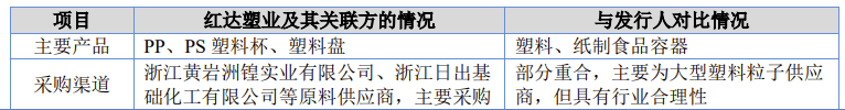 红达塑业由发行人实际控制人何麟君的兄弟何麟彬及其配偶控制。红达塑业及其全资子公司台州市椒江红达塑业有限公司主要从事生产和销售一次性餐饮塑料杯、纸杯和打包碗,与发行人生产和销售的部分产品重合,存在相似业务。红达塑业及其关联方的主要产品、采购渠道、销售渠道、生产工艺等具体情况如下: