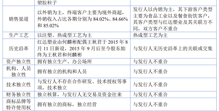 公司与红达塑业及其关联主体不存在人员重合的情况。此外,报告期内发行人与红达塑业及其关联方不存在关联交易和资金往来。除部分供应商重合外,红达塑业及其关联方的客户、供应商与发行人的客户、供应商无重合。红达塑业及其关联方自设立起,与发行人在资产、业务、人员、机构、财务方面互相独立,不存在利益输送等损害发行人利益的情形。