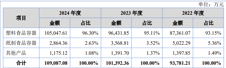 2022年、2023年、2024年,塑料食品容器占公司主营业务收入的比例均超过 90%,是公司主要销售产品。而且报告期内纸制食品容器收入持续下降,从2022年的5022万元下降到2023年的3569万元,2024年进一步下降到2864万元。