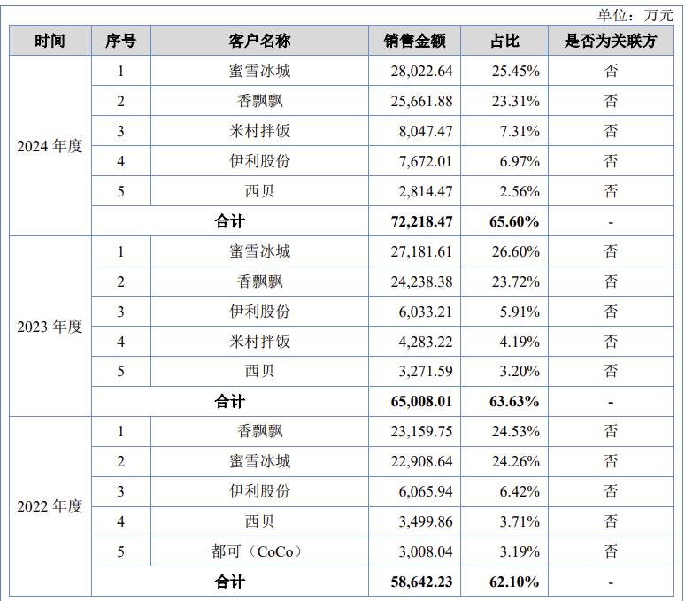 2022年、2023年、2024年,公司前五大客户合计贡献收入占总收入的比例分别为62.10%、63.63%、65.60%,客户集中度较高且集中度持续小幅提高。蜜雪冰城、香飘飘、伊利股份、西贝等四家知名企业报告期均名列公司前五大客户。