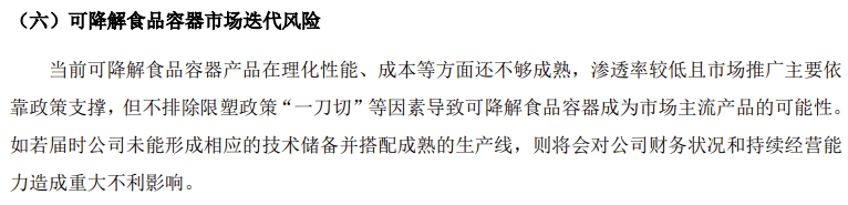 招股书提示了可降解食品容器市场迭代风险:当前可降解食品容器产品在理化性能、成本等方面还不够成熟,渗透率较低且市场推广主要依靠政策支撑,但不排除限塑政策“一刀切”等因素导致可降解食品容器成为市场主流产品的可能性。如若届时公司未能形成相应的技术储备并搭配成熟的生产线,则将会对公司财务状况和持续经营能力造成重大不利影响。
