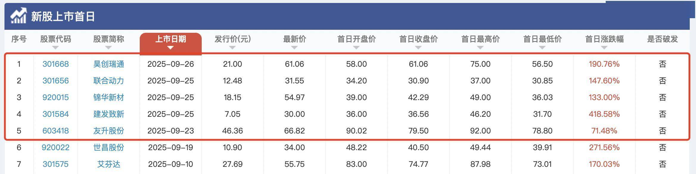 回顾上周(9月22日-9月26日),A股迎来了5只“新成员”。在首日表现中,5只新股全线飘红,其中建发致新领跑,涨幅达418.58%;而昊创瑞通紧随其后,分别涨190.76%。