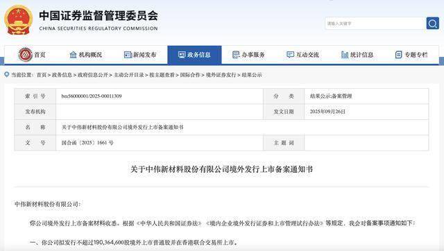 瑞财经 吴文婷近日,中伟新材料股份有限公司(以下简称“中伟股份”)赴港IPO获中国证监会备案,公司拟发行不超过190,364,600股境外上市普通股并在香港联合交易所上市。