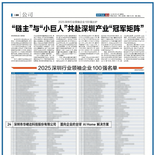 近期,由深圳市工商业联合会(总商会)及深圳报业集团指导的“2025深圳行业领袖企业100强”榜单正式揭晓。深圳市华曦达科技股份有限公司凭借在全球企业级AI Home解决方案领域的技术领先性、持续的创新能力和生态构建优势,成功蝉联该项殊荣。