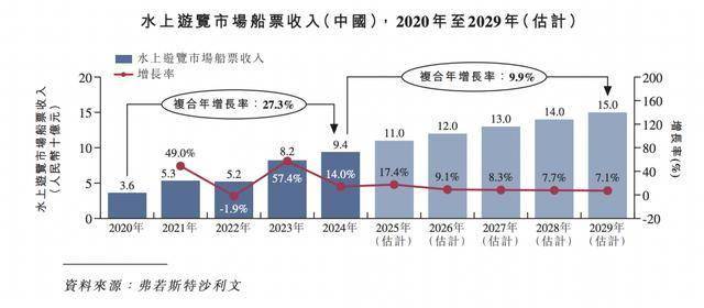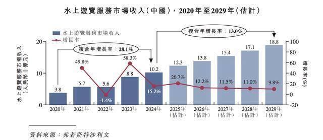 2024年,中国水上游览服务市场收入从2020年的人民币38亿元增长至人民币102亿元。2024年,发改委及相关部门印发《推动文化和旅游领域设备更新实施方案》,力争到2027年,引导推动全国文化和旅游领域更新一批设施设备,全面提升服务质量,推动行业高质量发展。方案提出,推动重点旅游景区陆上、水上及空中旅游观光设备升级,更新一批高技术、高效率、低能耗的先进设备,包括非公路用旅游观光车辆、观光游轮、旅游观光船、快艇等。