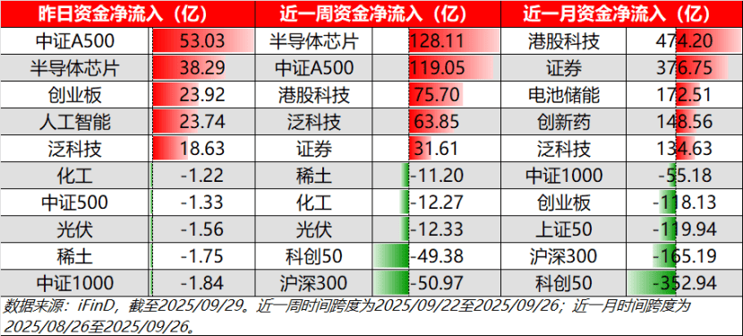 从日、周和月三重维度分析,泛科技类在三重维度上均延续资金净流入态势,均位居资金净流入前五。半导体科技和中证A500则在日、周维度上或资金青睐,均位居前二。